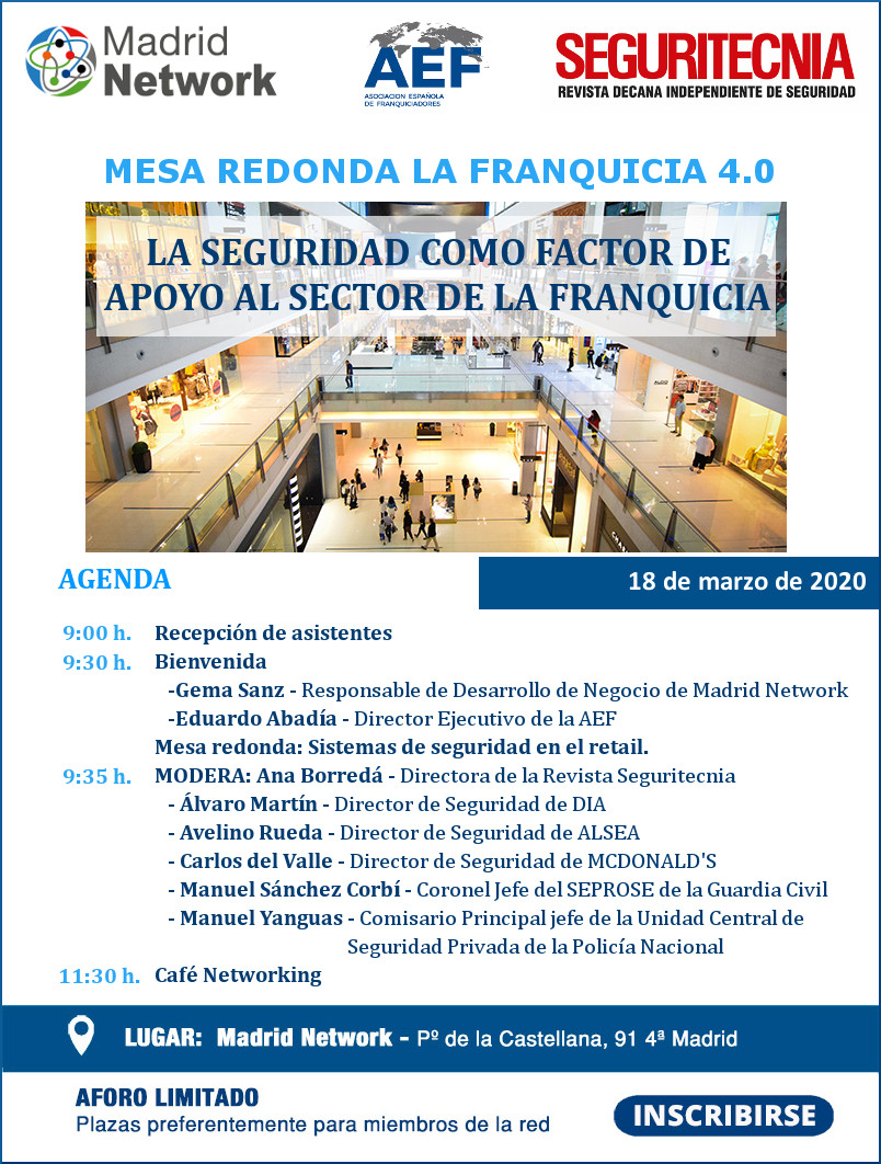 Os invitamos a una nueva jornada organizada por la AEF y Madrid Network titulada: La Franquicia 4.0, La Seguridad como Factor de Apoyo al Sector de la Franquicia.